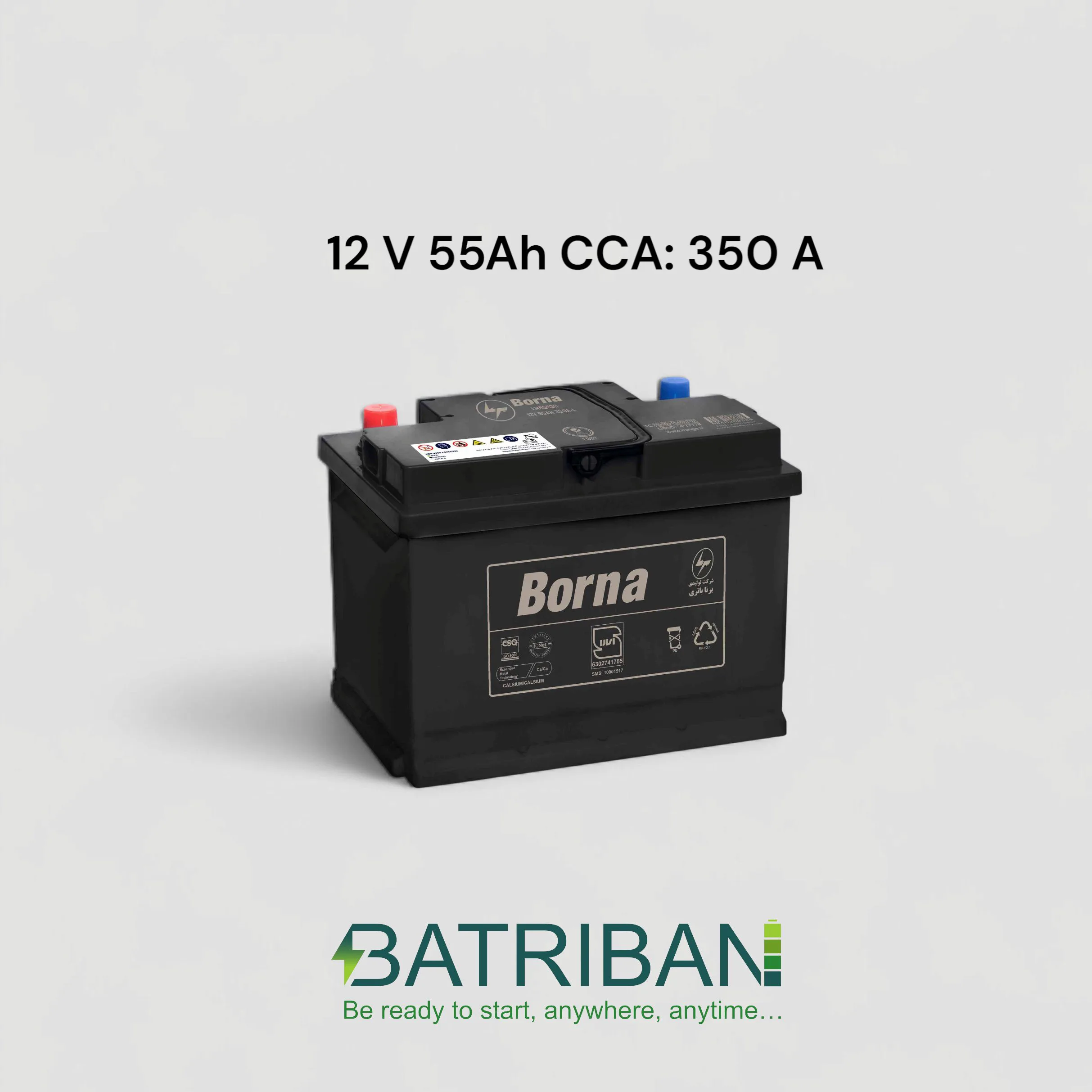باتری 55 آمپر برنا دارای جریان الکتریکی 50 آمپر و استاندارد A 300(EN) می باشد. این باتری برای خودروهایی نظیر پراید، پژو 206( سال 97 به بعد)، پژو 207(سال 97 به بعد)، کوییک، تیبا، ساینا، رانا(سال 97 به بعد)، رانا پلاس، هیوندای i20 و… مناسب بوده و همخوانی با شارژ دینام آنها خواهد داشت.
